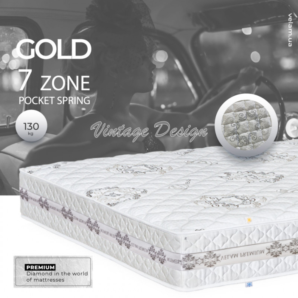 Матрац пружинний «ГОЛД» ◇ 7 - Zone ВЕЛАМ З чим у Вас асоціюється золото? Звичайно ж з дорогим вишуканим виробом. Модель «Голд», представлена у новій тканини Vintage Design, малюнок якої нагадує нам неймовiрну вінтажну прикрасу. Якщо Ви любитель комфорту - це матрац для Вас! Семизонний пружинний блок «Pocket Spring» і повітропроникні податливі листи латексу створюють необхідний рівень еластичності. Чохол матраца з трикотажу виконаний за технологією глибокого вистьобування. У наповнювачі основних деталей чохла використані волокна бавовни і вовни для створення ефекту «Зима-Літо». Висота настилу з латексу - 3 см. ПАМ'ЯТКА КОРИСТУВАЧА МАТРАЦА Що буде, якщо ігнорувати Рекомендації, зазначені в "Пам'ятці"? Що необхідно врахувати при замовленні матраца нестандартної форми чи розміру? Догляд за матрацом Виконувати глибоку чистку дозволяється тільки клінінговій компанії (або хімчистці). Спеціалісти допоможуть зберегти м’якість та розміри виробу, забезпечити повне висихання наповнювачів та настилів Краще одразу звернутись до хімчистки або викликати клінінгову компанію додому. Спеціалісти допоможуть зберегти м’якість та розміри виробу, забезпечити повне висихання наповнювачів та настилів; Самостійно виведена пляма може залишити контур від миючого засобу. Також не варто застосовувати засоби зі змістом хлору; Для екстреного видалення мокрих плям скористайтесь паперовими серветками; У випадку неможливості звернення до спеціалізованої чистки скористуйтесь розповсюдженими порадами з Інтернету, які ми обрали для Вас: КЛАСИЧНІ рекомендації, як зберегти «свіжість» поверхні матраца на довго. ЧИСТКА МАТРАЦА: Суха. Волога. Виведення плям. ЯК СУШИТИ МАТРАЦ Холодний сезон ЗНІМНІ ЧОХЛИ ЗНАЧКИ на ЯРЛИКУ ДОГЛЯД за ЛІЖКОМ Якщо якість матраца продовжує Вас влаштовувати після закінчення строку служби, вказаного на ярлику, немає необхідності його замінювати. Дотримуйтесь наших порад і Ваш матрац буде довго зберігати свіжість.