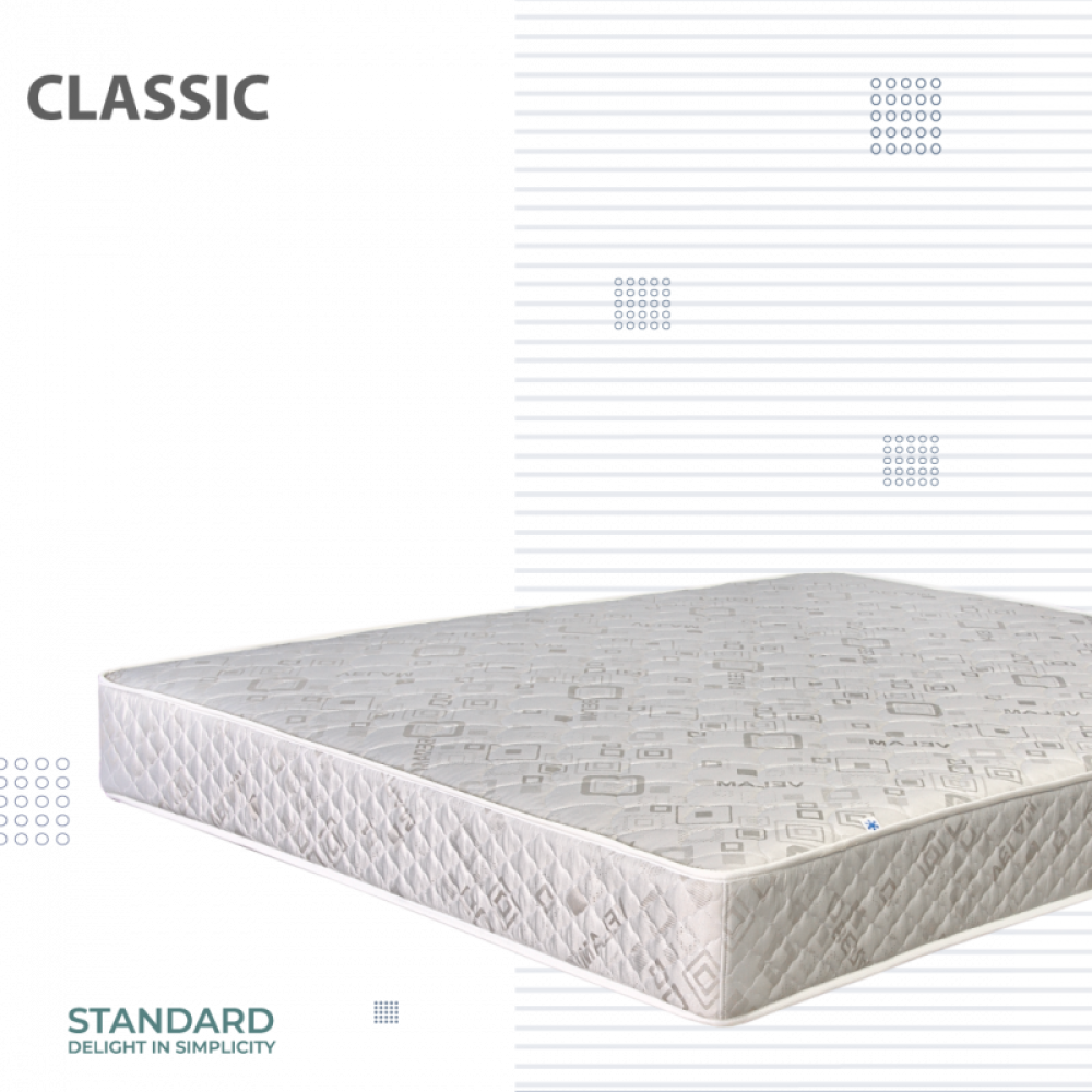 Матрац пружинний "КЛАСИК" ВЕЛАМ Модель люксової якості. Поєднання двох кращих пропозицій: ціни i комфорту. ПАМ'ЯТКА КОРИСТУВАЧА МАТРАЦА Що буде, якщо ігнорувати Рекомендації, зазначені в "Пам'ятці"? Що необхідно врахувати при замовленні матраца нестандартної форми чи розміру? Догляд за матрацом Виконувати глибоку чистку дозволяється тільки клінінговій компанії (або хімчистці). Спеціалісти допоможуть зберегти м’якість та розміри виробу, забезпечити повне висихання наповнювачів та настилів Краще одразу звернутись до хімчистки або викликати клінінгову компанію додому. Спеціалісти допоможуть зберегти м’якість та розміри виробу, забезпечити повне висихання наповнювачів та настилів; Самостійно виведена пляма може залишити контур від миючого засобу. Також не варто застосовувати засоби зі змістом хлору; Для екстреного видалення мокрих плям скористайтесь паперовими серветками; У випадку неможливості звернення до спеціалізованої чистки скористуйтесь розповсюдженими порадами з Інтернету, які ми обрали для Вас: КЛАСИЧНІ рекомендації, як зберегти «свіжість» поверхні матраца на довго. ЧИСТКА МАТРАЦА: Суха. Волога. Виведення плям. ЯК СУШИТИ МАТРАЦ Холодний сезон ЗНІМНІ ЧОХЛИ ЗНАЧКИ на ЯРЛИКУ ДОГЛЯД за ЛІЖКОМ Якщо якість матраца продовжує Вас влаштовувати після закінчення строку служби, вказаного на ярлику, немає необхідності його замінювати. Дотримуйтесь наших порад і Ваш матрац буде довго зберігати свіжість.