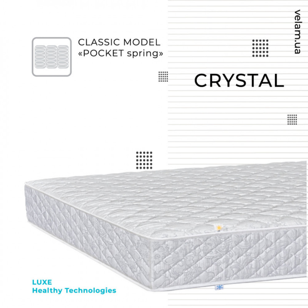 Матрац пружинний «КРИСТАЛ» ВЕЛАМ Модель - оптимальної жорсткості. Основу моделі складає пружинний блок «Pocket Spring». У комплектації матраца використаний сучасний нетканий матеріал «Sprut» з класичною вертикальною орієнтацією волокон, що забезпечує оптимальний рівень комфорту. При досить демократичній ціні, такий матрац стає вдалим придбанням. Міцний сон - важлива умова здоров`я. Давні римляни визначали «Сrystal» як «дарування здоров`я». ПАМ'ЯТКА КОРИСТУВАЧА МАТРАЦА Що буде, якщо ігнорувати Рекомендації, зазначені в "Пам'ятці"? Що необхідно врахувати при замовленні матраца нестандартної форми чи розміру? Догляд за матрацом Виконувати глибоку чистку дозволяється тільки клінінговій компанії (або хімчистці). Спеціалісти допоможуть зберегти м’якість та розміри виробу, забезпечити повне висихання наповнювачів та настилів. Краще одразу звернутись до хімчистки або викликати клінінгову компанію додому. Спеціалісти допоможуть зберегти м’якість та розміри виробу, забезпечити повне висихання наповнювачів та настилів; Самостійно виведена пляма може залишити контур від миючого засобу. Також не варто застосовувати засоби зі змістом хлору; Для екстреного видалення мокрих плям скористайтесь паперовими серветками; У випадку неможливості звернення до спеціалізованої чистки скористуйтесь розповсюдженими порадами з Інтернету, які ми обрали для Вас: КЛАСИЧНІ рекомендації, як зберегти «свіжість» поверхні матраца на довго. ЧИСТКА МАТРАЦА: Суха. Волога. Виведення плям. ЯК СУШИТИ МАТРАЦ Холодний сезон ЗНІМНІ ЧОХЛИ ЗНАЧКИ на ЯРЛИКУ ДОГЛЯД за ЛІЖКОМ Якщо якість матраца продовжує Вас влаштовувати після закінчення строку служби, вказаного на ярлику, немає необхідності його замінювати. Дотримуйтесь наших порад і Ваш матрац буде довго зберігати свіжість.
