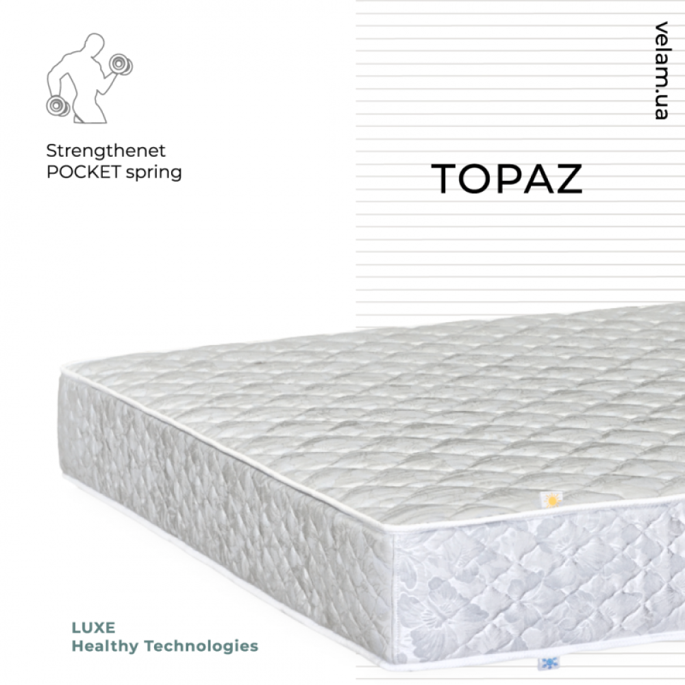 Матрац пружинний «ТОПАЗ» ВЕЛАМ Основа - блок незалежних пружин «Pocket Spring» забезпечує відмінну адаптацію поверхонь матраца до особливостей будови тіла людини і його пружну підтримку.Мета створення матраца - запропонувати варіант виробу з підвищеною стійкістю до навантажень. Для виготовлення пружин застосований дріт більшої товщини (d=1,9 мм). Жодної зайвої деталі здатної порушити гармонію середовища. На «ТОПАЗ» можна покластися. ПАМ'ЯТКА КОРИСТУВАЧА МАТРАЦА Що буде, якщо ігнорувати Рекомендації, зазначені в "Пам'ятці"? Що необхідно врахувати при замовленні матраца нестандартної форми чи розміру? Догляд за матрацом Виконувати глибоку чистку дозволяється тільки клінінговій компанії (або хімчистці). Спеціалісти допоможуть зберегти м’якість та розміри виробу, забезпечити повне висихання наповнювачів та настилів Краще одразу звернутись до хімчистки або викликати клінінгову компанію додому. Спеціалісти допоможуть зберегти м’якість та розміри виробу, забезпечити повне висихання наповнювачів та настилів; Самостійно виведена пляма може залишити контур від миючого засобу. Також не варто застосовувати засоби зі змістом хлору; Для екстреного видалення мокрих плям скористайтесь паперовими серветками; У випадку неможливості звернення до спеціалізованої чистки скористуйтесь розповсюдженими порадами з Інтернету, які ми обрали для Вас: КЛАСИЧНІ рекомендації, як зберегти «свіжість» поверхні матраца на довго. ЧИСТКА МАТРАЦА: Суха. Волога. Виведення плям. ЯК СУШИТИ МАТРАЦ Холодний сезон ЗНІМНІ ЧОХЛИ ЗНАЧКИ на ЯРЛИКУ ДОГЛЯД за ЛІЖКОМ Якщо якість матраца продовжує Вас влаштовувати після закінчення строку служби, вказаного на ярлику, немає необхідності його замінювати. Дотримуйтесь наших порад і Ваш матрац буде довго зберігати свіжість.